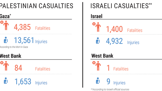 Since 7 October, 4,385 Palestinians have been killed, including at least 1,756 children and 967 women, and about 13,561 have been injured, according to the MoH in Gaza. The reported fatality toll in Gaza during the 15 days of hostilities is about 84 per cent higher than the total number of fatalities during the 50-day escalation of hostilities in 2014 (2,251 Palestinian fatalities).